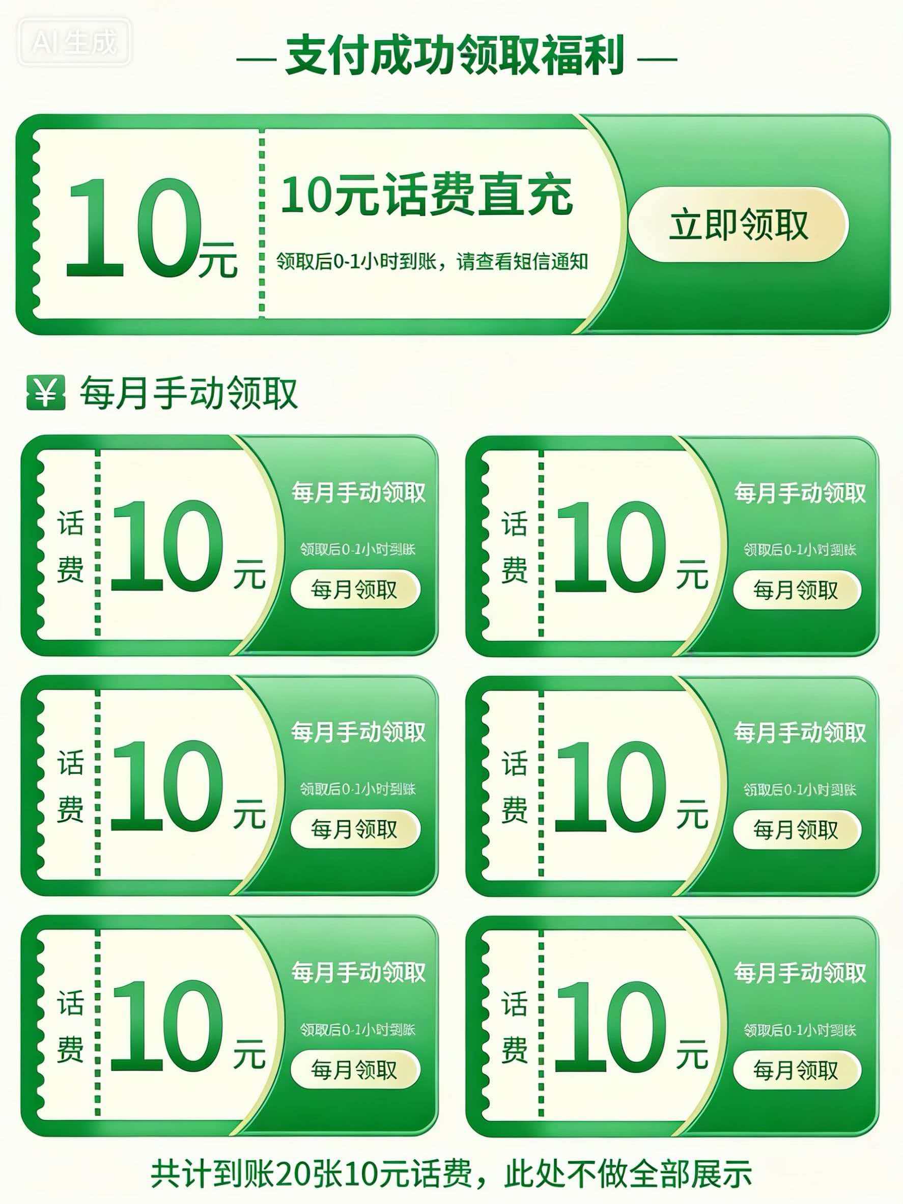 后续领取:每月按首次充值日(如 4 号充值,次月 4 号起),通过领取链接领取 10 元话费。